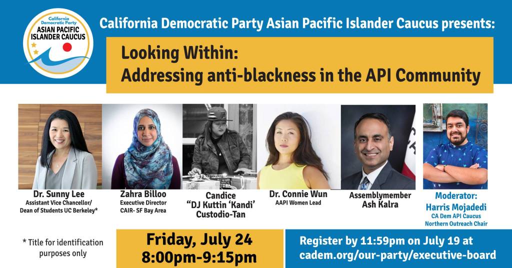 The Asian Pacific Islanders Caucus of the California Democratic Party will be holding its first virtual Executive Board Meeting tonight. After brief opening reports the API Caucus is excited to hold its panel discussion “Looking Within: Addressing anti-blackness in the API Community,” moderated by our own Northern Outreach Chair Harris Mojadedi.
