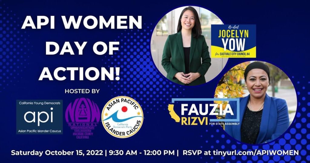 CYD API Caucus are hosting a API Women Day of Action in partnership with the California Democratic Party API Caucus and Riverside County NOW for Fauzia Rizvi for State Assembly and Jocelyn Yow for Eastvale City Council Re-election!