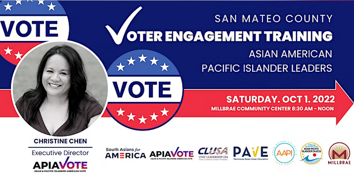 Voter Engagement Training in Millbrae on Oct 1 Please join our interactive voter engagement training for AAPI-identified leaders in San Mateo County led by Christine Chen, executive director and founder of the Asian Pacific Islander American Vote (APIAVote), a nationally recognized and leading nonprofit in AAPI civic engagement.